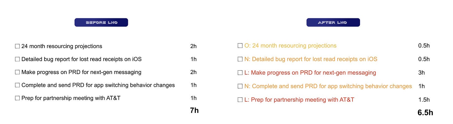 An example shared by Shreyas on how his to-do lists looks before and after using LNO framework. (Before vs After)