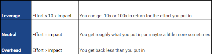 The first step is to identify which task goes into which category. After identifying the tasks, the key is to spend less time on tasks that are overhead, and use that time to work on leverage tasks. If you have less time, try to delegate overhead tasks (not very recommended).
